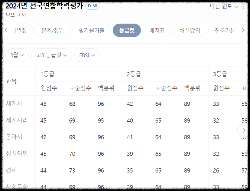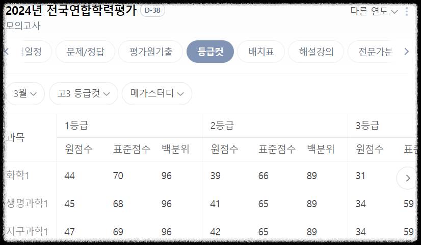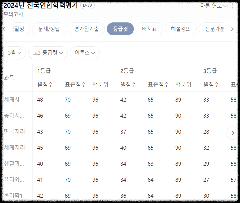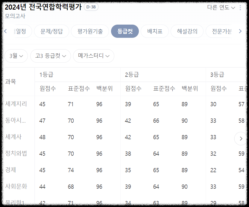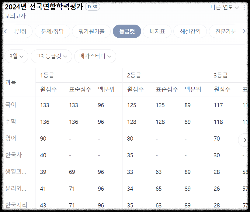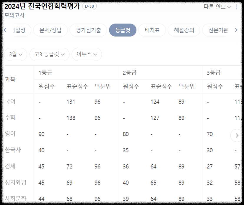3월 모의고사 등급 컷 (고3)